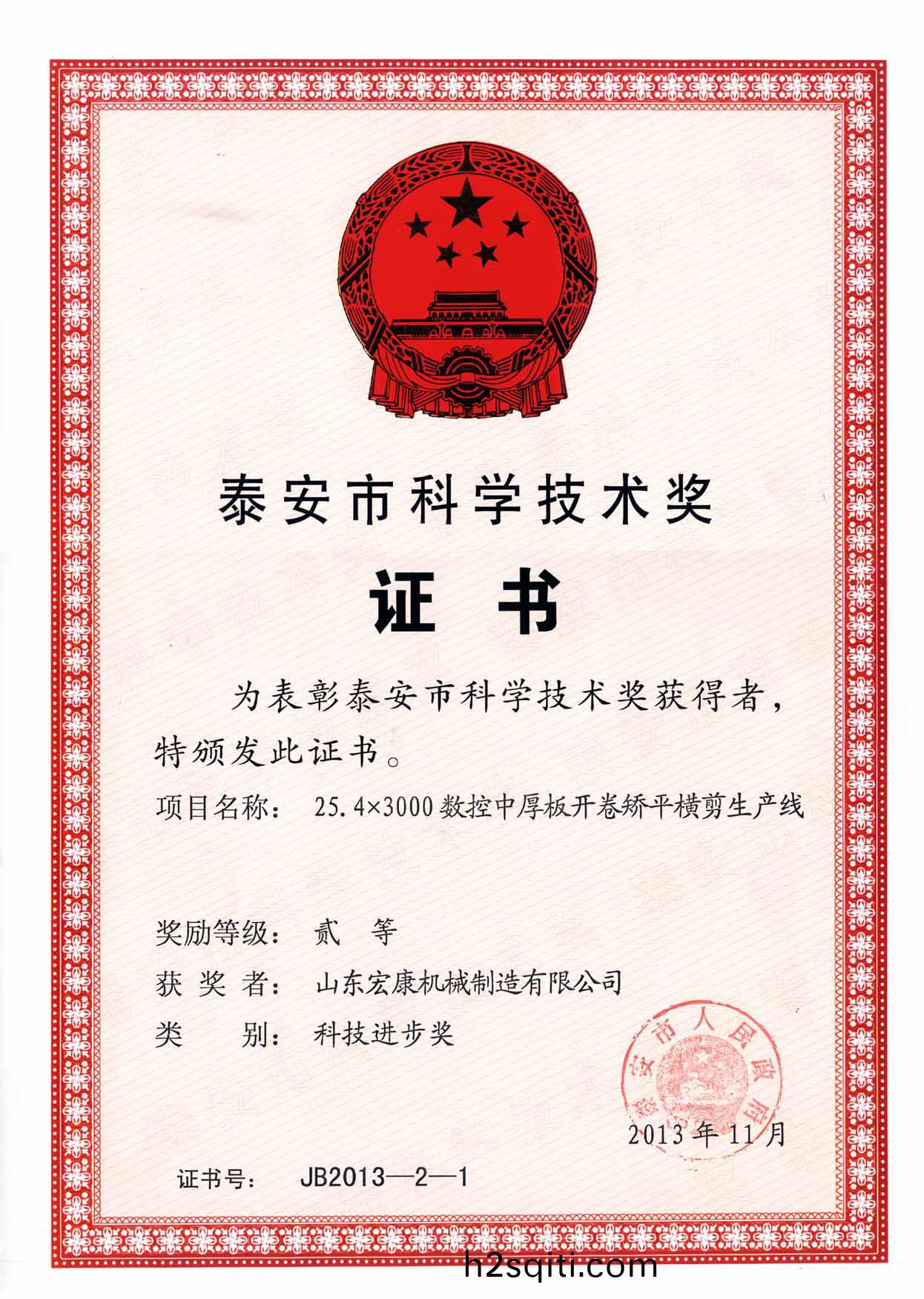 5月7日下午,全市科学技术奖励大会召开。会议对2013年度泰安市科学技术最高奖、泰安市科技进步奖获得者、泰安市科技创新工作先进县市区进行表彰。集团公司完成的25.4×3000数控中厚板开卷矫平横剪生产线荣获泰安市科技进步二等奖。这是集团公司在科技研发中取得的又一殊荣,也是本年度奖励大会中受到表彰的机械行业为数不多的奖项。