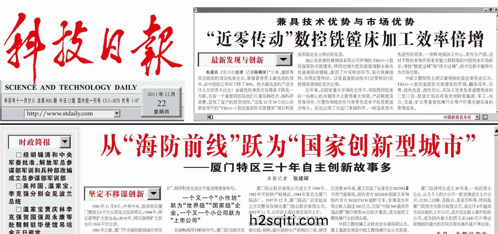 “近零传动”数控铣镗床加工效率倍增《科技日报》 2011年12月22日总第9081期